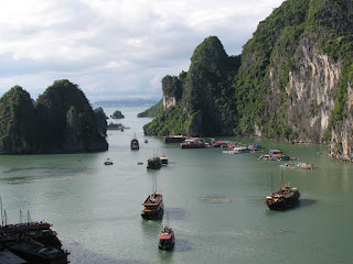 The next two days, I was scheduled to go on a tour of Ha Long Bay aboard a Vietnamese junk boat. Ha Long bay is in the Gulf of Tonkin east of Hanoi a few hours. It is one of the natural wonders of the world. You’ve all seen it on TV or movies before. The water is emerald green with tall limestone cliffs shooting out of it. It is amazingly beautiful. The hotel almost talked me out of it though. In most of SE Asia, you can book all tours and day activities right through the hotel. I had wanted to do Ha Long Bay after seeing some pictures and reading about it in the guidebooks. Right after I checked in, alone, to the hotel, I tried to book the trip. The girl at the front desk was going over the details with me and said,